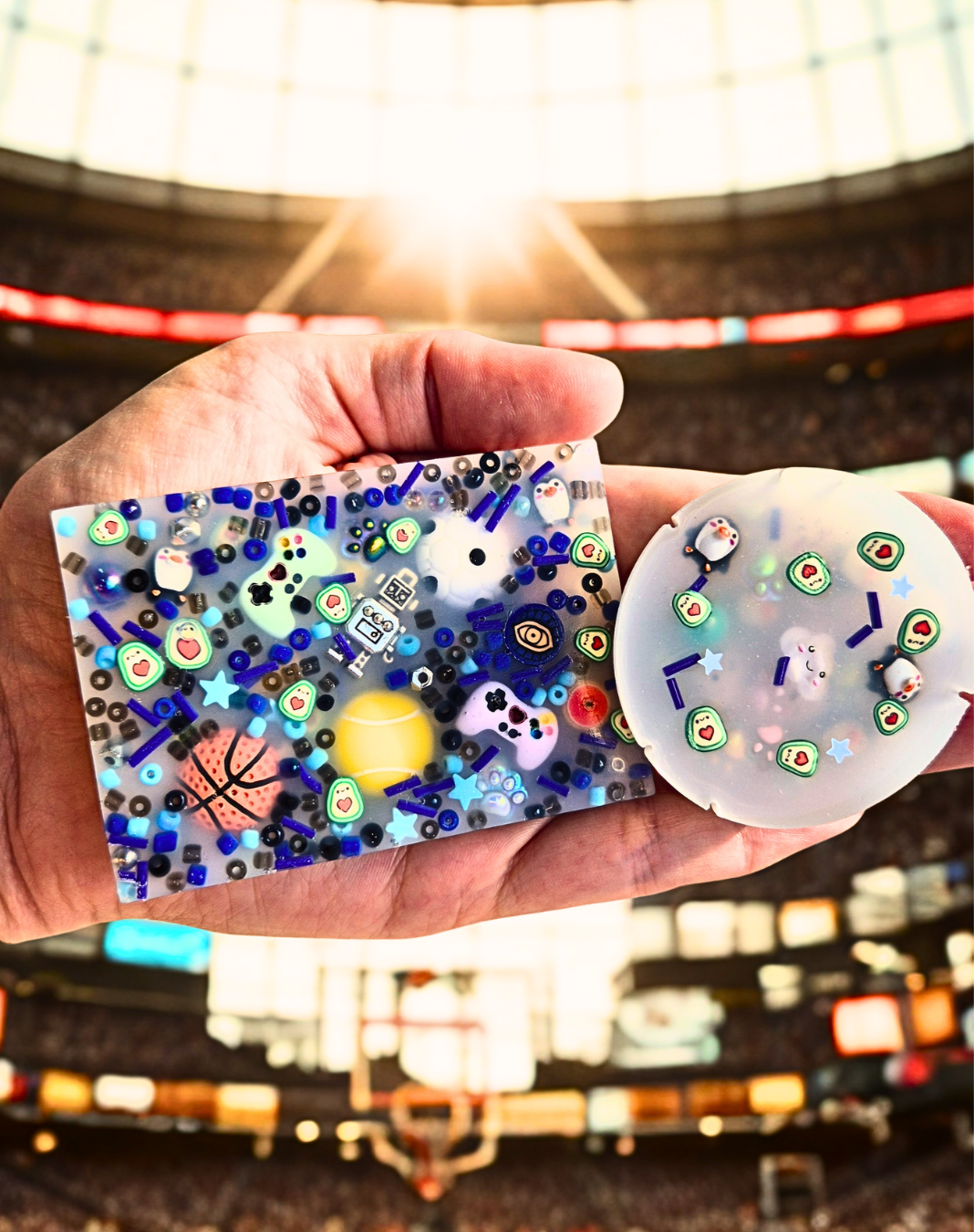 Each handmade duo features tiny basketballs, baseballs, penguins, game controllers, and smiling avo slices — all floating in soft, squishy silicone.